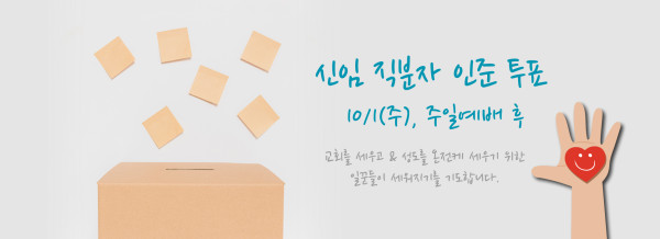 신임 직분자 인준 투표 페이지 정보 작성자 나성한미교회 댓글 0건 조회 4,530회 작성일 23-09-26 09:03 목록 본문 신임 직분자 인준 투표 10/1(주), 주일예배 후교회를 세우고 & 성도를 온전케 세우기 위한일꾼들이 세워지기를 기도합니다. 이전글세계성찬주일 23.09.27 다음글직분 대상자 교육 23.09.09 댓글 0 댓글목록 등록된 댓글이 없습니다. 목록