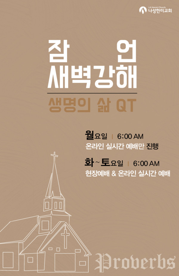 잠언 새벽강해 페이지 정보 작성자 나성한미교회 댓글 0건 조회 4,538회 작성일 23-09-27 13:32 목록 본문 잠언 새벽강해 월~토, 새벽 6시 <월요일> 온라인 실시간 예배만 진행<화~토요일> 현장예배 & 온라인 실시간 예배 이전글에베소서 새벽강해 23.09.27 다음글10월 공동체 식탁 23.09.27 댓글 0 댓글목록 등록된 댓글이 없습니다. 목록