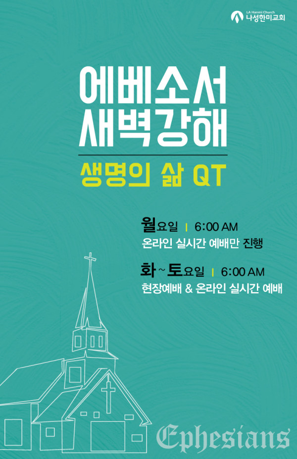 에베소서 새벽강해 페이지 정보 작성자 나성한미교회 댓글 0건 조회 4,630회 작성일 23-09-27 13:33 목록 본문 에베소서 새벽강해 월~토, 새벽 6시 <월요일> 온라인 실시간 예배만 진행<화~토요일> 현장예배 & 온라인 실시간 예배 이전글10월 사역일정표 23.09.28 다음글잠언 새벽강해 23.09.27 댓글 0 댓글목록 등록된 댓글이 없습니다. 목록