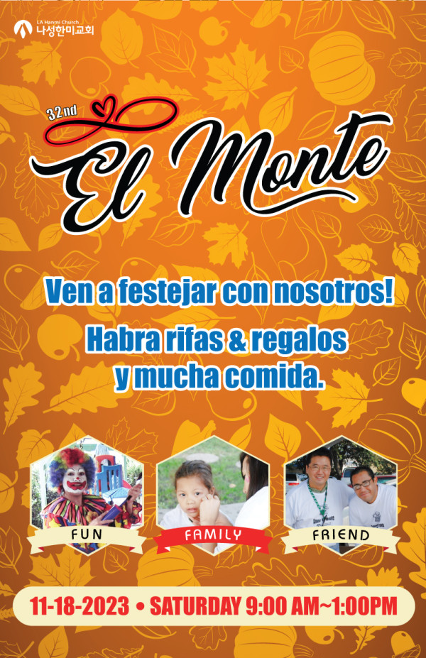 주님께서 맡겨주신 사명과 부르신 소명으로 세상을 향한 증인됨을 전하기 위해 "추수와 감사의 계절"을 맞아 나성한미교회가 EL MONTE 지역의 이웃들을 그리스도의 몸된 교회로 초청하고 섬기는 "제 32회 LOVE LE MONTE" 를 11/18(토) 개최합니다.