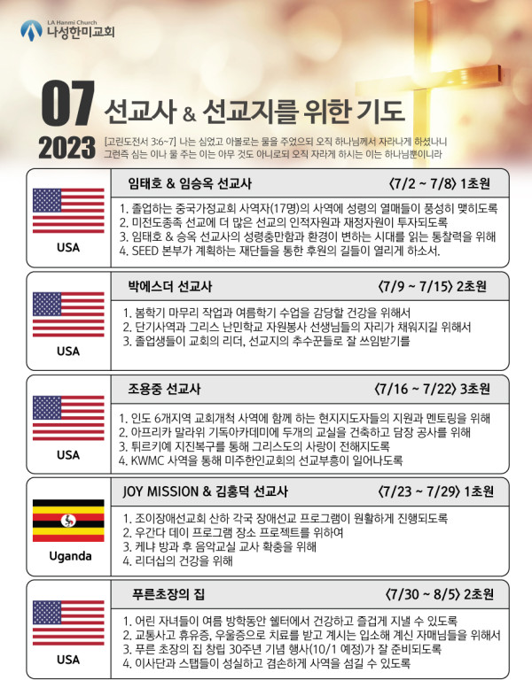 2023년도 7월 동역 선교지 & 선교사 기도제목 페이지 정보 작성자 나성한미교회 댓글 0건 조회 5,246회 작성일 23-06-28 06:09 목록 본문 이전글Back to School Blessings Prayers 23.07.21 다음글2023년 7월 사역일정표 23.06.24 댓글 0 댓글목록 등록된 댓글이 없습니다. 목록