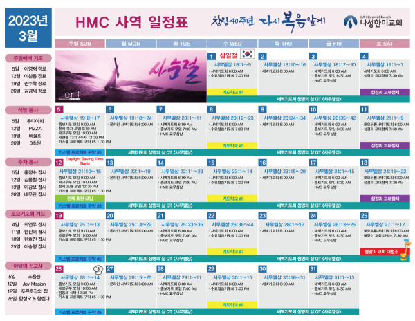 2023년 3월 사역일정표 페이지 정보 작성자 나성한미교회 댓글 0건 조회 5,287회 작성일 23-02-25 11:10 목록 본문 이전글Daylight Saving Time Starts 23.03.01 다음글튀르키예 & 시리아 지진 피해자를 돕기 위한 모금 23.02.15 댓글 0 댓글목록 등록된 댓글이 없습니다. 목록