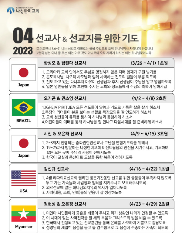 2023년도 4월 동역 선교지 & 선교사 기도제목 페이지 정보 작성자 나성한미교회 댓글 0건 조회 5,220회 작성일 23-03-24 12:07 목록 본문 이전글부활주일 & 창립 40주년 감사예배 & 담임목사 취임식 23.03.31 다음글고난주간 특별새벽기도회 "십자가만을 붙들리라" 23.03.24 댓글 0 댓글목록 등록된 댓글이 없습니다. 목록