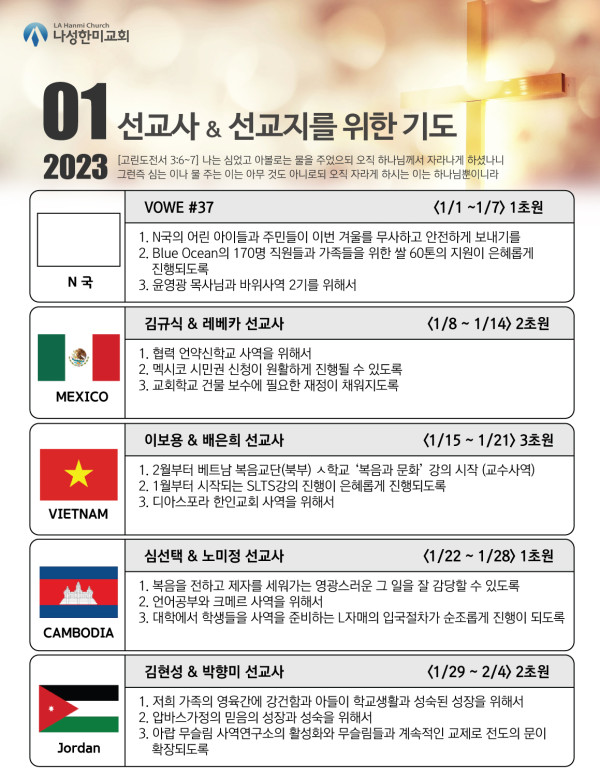 2023년도 1월 동역 선교지 & 선교사 기도제목 페이지 정보 작성자 나성한미교회 댓글 0건 조회 5,492회 작성일 22-12-27 09:24 목록 본문 2023년도 1월 동역 선교지 & 선교사 기도제목 이전글<신년특새> 야고보서 새벽강해 "믿는 만큼 행동한다" 22.12.30 다음글창립 40주년 다시 복음 앞에 22.12.23 댓글 0 댓글목록 등록된 댓글이 없습니다. 목록