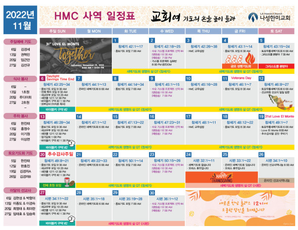 11월 사역일정표 페이지 정보 작성자 나성한미교회 댓글 0건 조회 4,621회 작성일 22-10-28 14:36 목록 본문 11월 사역일정표 이전글추수감사절 예배 Always Grateful 22.11.10 다음글[새만클 12기] 소중한 당신을 초대합니다. 22.10.27 댓글 0 댓글목록 등록된 댓글이 없습니다. 목록
