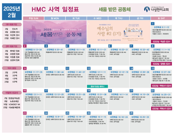 2025년 2월 사역일정표 페이지 정보 작성자 나성한미교회 댓글 0건 조회 2,026회 작성일 25-02-01 15:06 목록 본문 2025년 2월 사역일정표 이전글2025년도 2월 동역 선교지 & 선교사 기도제목 25.02.01 다음글2025년도 1월 동역 선교지 & 선교사 기도제목 25.01.02 댓글 0 댓글목록 등록된 댓글이 없습니다. 목록