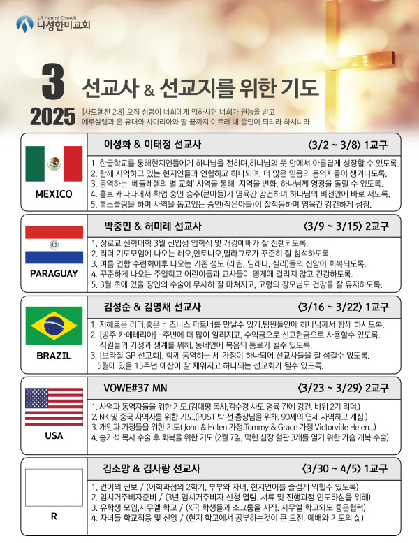 2025년도 3월 동역 선교지 & 선교사 기도제목 페이지 정보 작성자 나성한미교회 댓글 0건 조회 2,363회 작성일 25-02-23 12:53 목록 본문 2025년도 3월 동역 선교지 & 선교사 기도제목 이전글2025년 전체 구역 모임 25.02.26 다음글2025년 3월 사역일정표 25.02.22 댓글 0 댓글목록 등록된 댓글이 없습니다. 목록