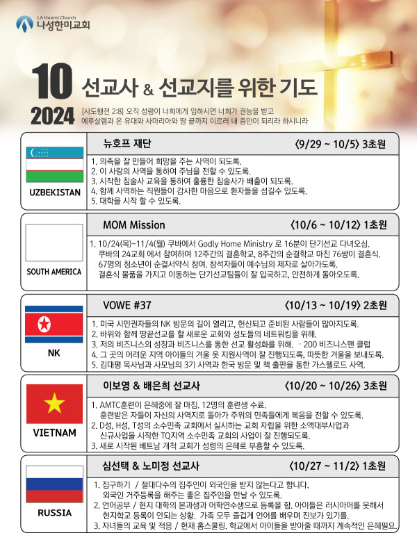 2024년도 10월 동역 선교지 & 선교사 기도제목 페이지 정보 작성자 나성한미교회 댓글 0건 조회 3,084회 작성일 24-10-01 19:35 목록 본문 2024년도 10월 동역 선교지 & 선교사 기도제목 이전글갈라디아서 새벽강해 [생명의 삶 QT] 24.10.18 다음글2024년 10월 사역일정표 24.10.01 댓글 0 댓글목록 등록된 댓글이 없습니다. 목록