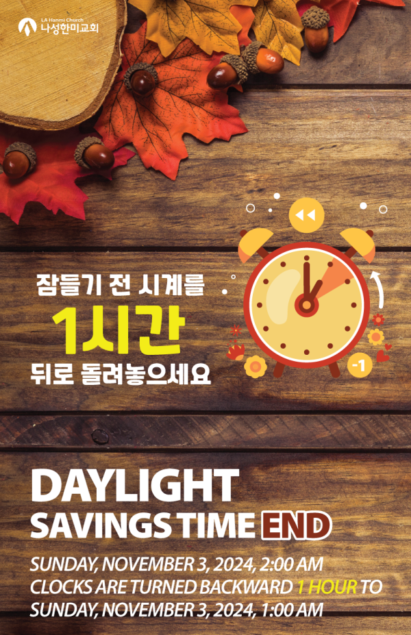DAYLIGHT Savings Time End 페이지 정보 작성자 나성한미교회 댓글 0건 조회 2,878회 작성일 24-11-02 09:47 목록 본문 DAYLIGHT Savings Time End 이전글시편 새벽강해 -생명의 삶 QT 24.11.09 다음글2024년도 11월 동역 선교지 & 선교사 기도제목 24.10.30 댓글 0 댓글목록 등록된 댓글이 없습니다. 목록
