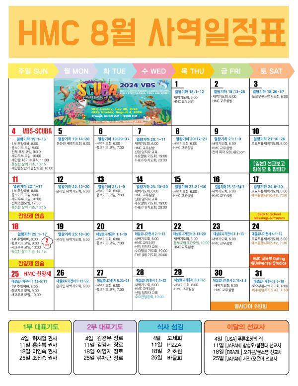 2024년 8월 사역일정표 페이지 정보 작성자 나성한미교회 댓글 0건 조회 3,350회 작성일 24-07-27 14:29 목록 본문 2024년 8월 사역일정표 이전글2024년도 8월 동역 선교지 & 선교사 기도제목 24.07.27 다음글2024 VBS [SCUBA] 24.07.26 댓글 0 댓글목록 등록된 댓글이 없습니다. 목록