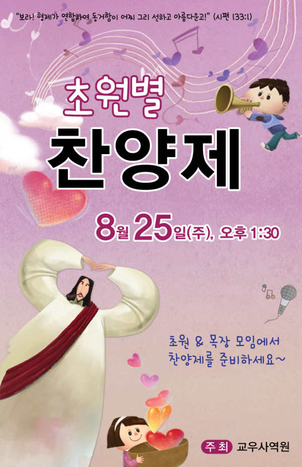 초원별 찬양제 페이지 정보 작성자 나성한미교회 댓글 0건 조회 3,236회 작성일 24-08-14 13:14 목록 본문 초원별 찬양제8/25 (주), 1:30 PM초원 & 목장에서 찬양제를 준비하세요 이전글EDUCATION MINISTRY OUTING 24.08.14 다음글데살로니가전후 새벽강해 [생명의 삶 QT] 24.08.10 댓글 0 댓글목록 등록된 댓글이 없습니다. 목록