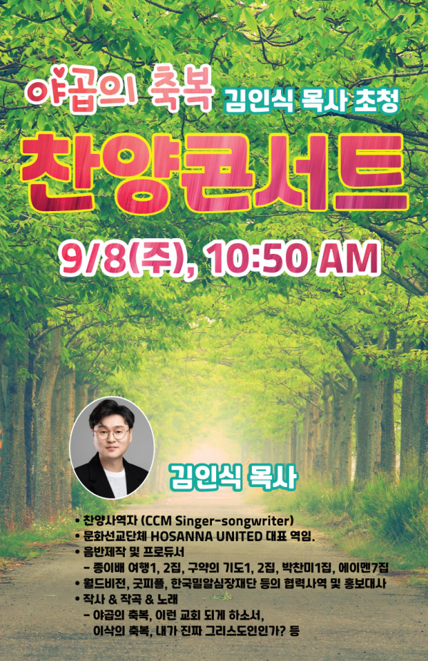 야곱의 축복 [김인식 목사] 초청 찬양 콘서트 페이지 정보 작성자 나성한미교회 댓글 0건 조회 3,432회 작성일 24-08-17 08:33 목록 본문 야곱의 축복 [김인식 목사] 초청 찬양 콘서트9/8(주), 10:50 AM 이전글[옹기장이 선교단] 초청 찬양 콘서트 24.08.29 다음글예수동행훈련 시리즈 / 예수님의 사람 #1 (2기) 24.08.14 댓글 0 댓글목록 등록된 댓글이 없습니다. 목록