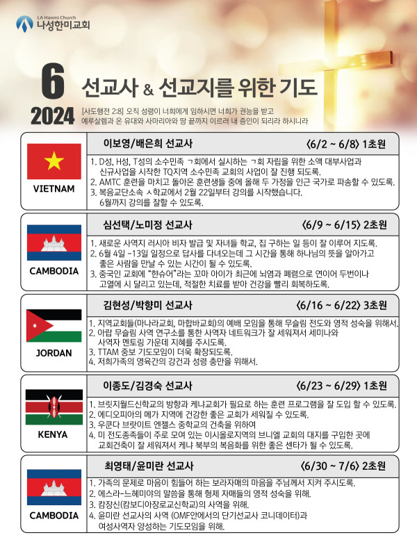 2024년도 6월 동역 선교지 & 선교사 기도제목 페이지 정보 작성자 나성한미교회 댓글 0건 조회 4,537회 작성일 24-05-28 07:44 목록 본문 2024년도 6월 동역 선교지 & 선교사 기도제목 이전글열왕기상 새벽강해 24.06.01 다음글2024년 6월 사역일정표 24.05.28 댓글 0 댓글목록 등록된 댓글이 없습니다. 목록