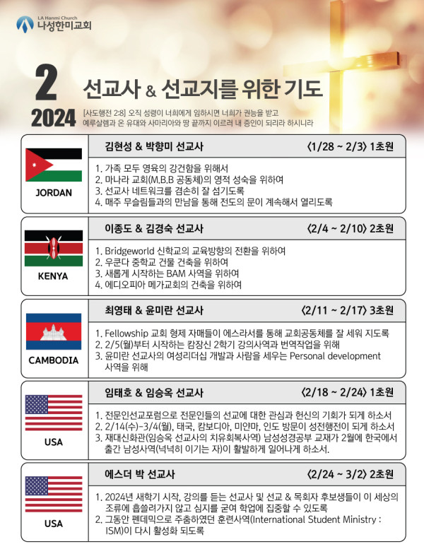 2024년도 2월 동역 선교지 & 선교사 기도제목 페이지 정보 작성자 나성한미교회 댓글 0건 조회 4,121회 작성일 24-02-09 10:09 목록 본문 2024년도 2월 동역 선교지 & 선교사 기도제목 이전글일상생활 속 일회용품 사용 줄이기 24.02.16 다음글2024년 2월 사역일정표 24.02.09 댓글 0 댓글목록 등록된 댓글이 없습니다. 목록
