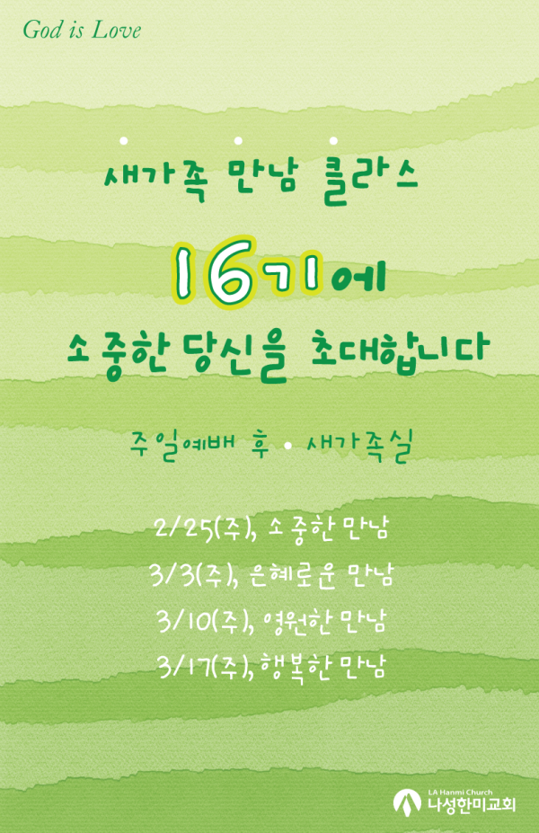 새가족 만남 클라스 새만클 16기 페이지 정보 작성자 나성한미교회 댓글 0건 조회 4,301회 작성일 24-02-28 07:50 목록 본문 새가족 만남 클라스 새만클 16기 이전글봄 맞이 목장별 심방 24.02.28 다음글새벽예배 시편 강해 24.02.28 댓글 0 댓글목록 등록된 댓글이 없습니다. 목록