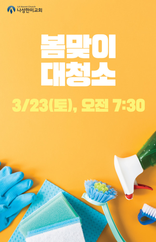 3/23(토), 봄 맞이 대청소 페이지 정보 작성자 나성한미교회 댓글 0건 조회 5,270회 작성일 24-02-28 13:39 목록 본문 봄 맞이 대청소 3/23(토) 이전글2024년도 3월 동역 선교지 & 선교사 기도제목 24.03.02 다음글봄 맞이 목장별 심방 24.02.28 댓글 0 댓글목록 등록된 댓글이 없습니다. 목록
