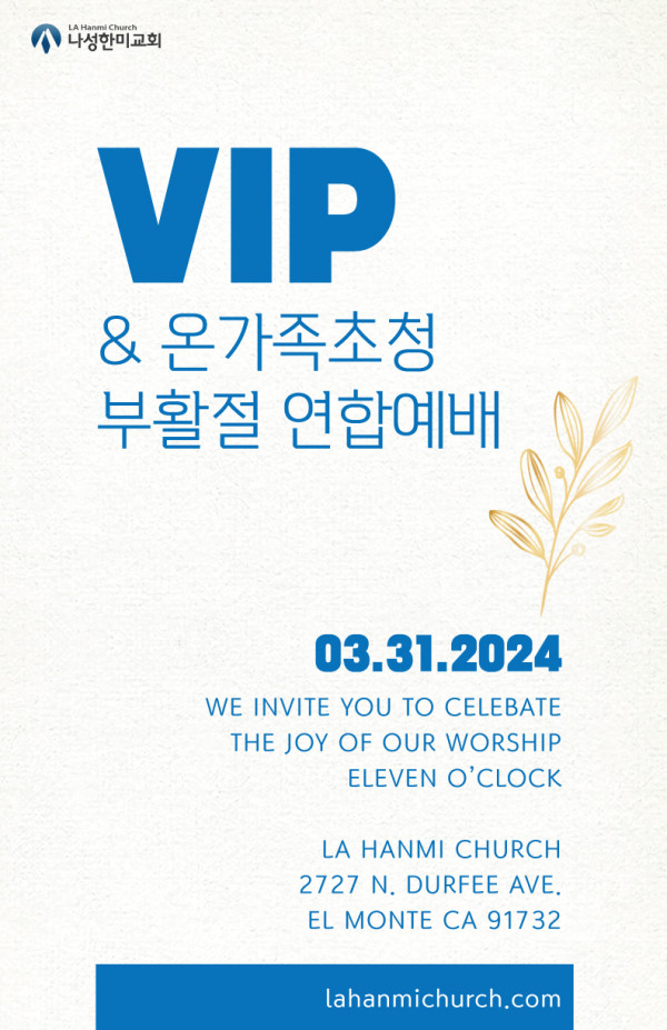 3/31(주), VIP 및 온가족초청 부활절 연합예배 페이지 정보 작성자 나성한미교회 댓글 0건 조회 5,501회 작성일 24-03-20 13:26 목록 본문 VIP 및 온가족초청 부활절 연합예배 3/31(주), 오전 11시 부활주일예배 이전글2024년도 4월 동역 선교지 & 선교사 기도제목 24.03.30 다음글3/29(금), 성금요예배 24.03.13 댓글 0 댓글목록 등록된 댓글이 없습니다. 목록