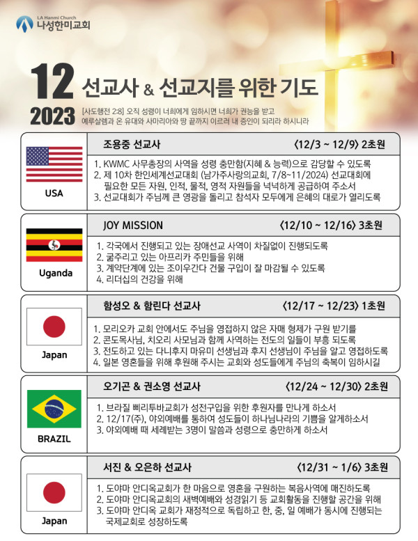 2023년도 12월 동역 선교지 & 선교사 기도제목 페이지 정보 작성자 나성한미교회 댓글 0건 조회 5,417회 작성일 23-11-30 08:15 목록 본문 이전글2023년도 성탄주일 "세상의 빛으로 오신 예수 그리스도" 23.11.30 다음글HAPPY THANKSGIVING~!! 23.11.22 댓글 0 댓글목록 등록된 댓글이 없습니다. 목록