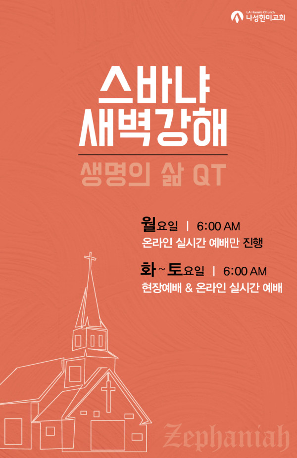 스바냐 새벽강해 페이지 정보 작성자 나성한미교회 댓글 0건 조회 4,324회 작성일 23-11-30 08:22 목록 본문 스바냐 새벽강해 월~토, 새벽 6시 <월요일> 온라인 실시간 예배만 진행<화~토요일> 현장예배 & 온라인 실시간 예배 이전글골로새서 새벽강해 23.11.30 다음글2023년도 성탄절예배 23.11.30 댓글 0 댓글목록 등록된 댓글이 없습니다. 목록