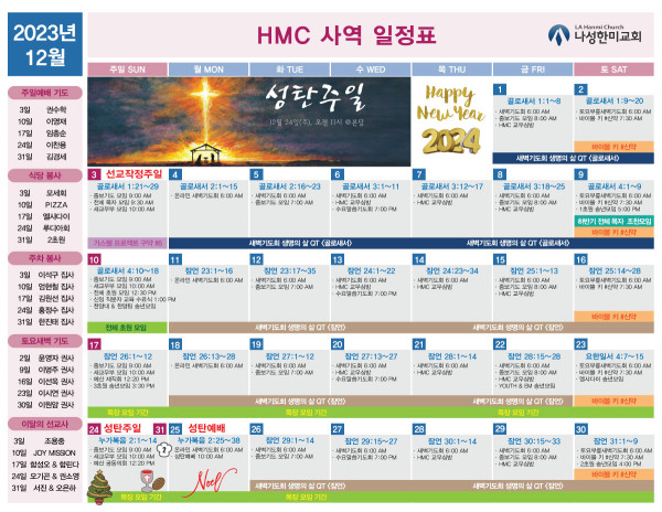 12월 사역일정표 페이지 정보 작성자 나성한미교회 댓글 0건 조회 4,158회 작성일 23-12-02 13:10 목록 본문 이전글2024년도 1월 동역 선교지 & 선교사 기도제목 23.12.28 다음글2023년도 송구영신예배 "보냄의 고백 & 출발의 예배" 23.11.30 댓글 0 댓글목록 등록된 댓글이 없습니다. 목록