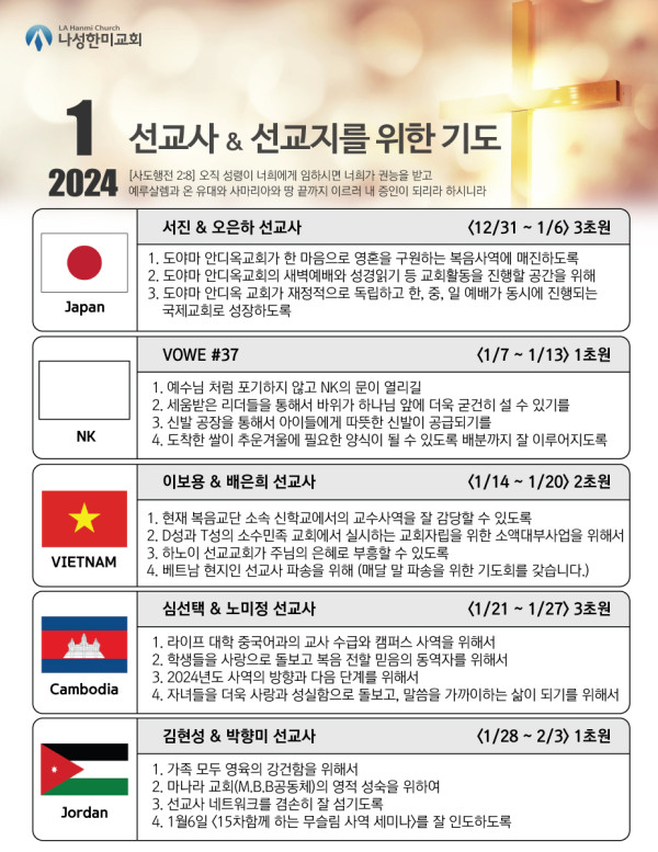 2024년도 1월 동역 선교지 & 선교사 기도제목 페이지 정보 작성자 나성한미교회 댓글 0건 조회 4,158회 작성일 23-12-28 07:55 목록 본문 이전글2024년 신년 특별새벽기도회 23.12.28 다음글12월 사역일정표 23.12.02 댓글 0 댓글목록 등록된 댓글이 없습니다. 목록