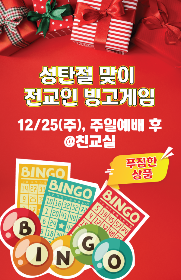 성탄절 맞이 전교인 빙고게임 페이지 정보 작성자 나성한미교회 댓글 0건 조회 4,941회 작성일 22-12-16 10:58 목록 본문 성탄절 맞이 전교인 빙고게임 12/25(주), 주일예배 후 @친교실푸짐한 상품이 준비되어 있습니다 이전글시무장로 이취임 감사예배 22.12.23 다음글연말모임 안내 22.12.16 댓글 0 댓글목록 등록된 댓글이 없습니다. 목록