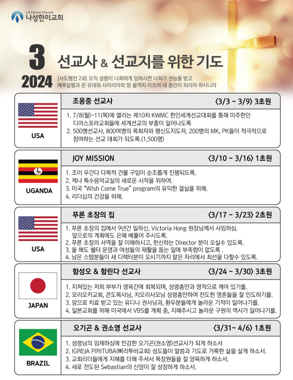 2024년도 3월 동역 선교지 & 선교사 기도제목 페이지 정보 작성자 나성한미교회 댓글 0건 조회 5,325회 작성일 24-03-02 21:01 목록 본문 2024년도 3월 동역 선교지 & 선교사 기도제목 이전글가스펠 프로젝트 신약 6 24.03.13 다음글3/23(토), 봄 맞이 대청소 24.02.28 댓글 0 댓글목록 등록된 댓글이 없습니다. 목록