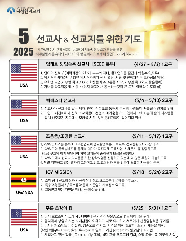 2025년도 5월 동역 선교지 & 선교사 기도제목 페이지 정보 작성자 나성한미교회 댓글 0건 조회 1,219회 작성일 25-04-26 16:51 목록 본문 2025년도 5월 동역 선교지 & 선교사 기도제목 이전글2025 Kids blessing 25.04.30 다음글2025년 5월 사역일정표 25.04.26 댓글 0 댓글목록 등록된 댓글이 없습니다. 목록
