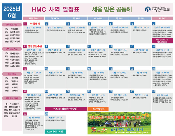 2025년 6월 사역일정표 페이지 정보 작성자 나성한미교회 댓글 0건 조회 1,039회 작성일 25-05-24 14:52 목록 본문 2025년 6월 사역일정표 이전글2025년도 6월 동역 선교지 & 선교사 기도제목 25.05.24 다음글2025 Kids blessing 25.04.30 댓글 0 댓글목록 등록된 댓글이 없습니다. 목록