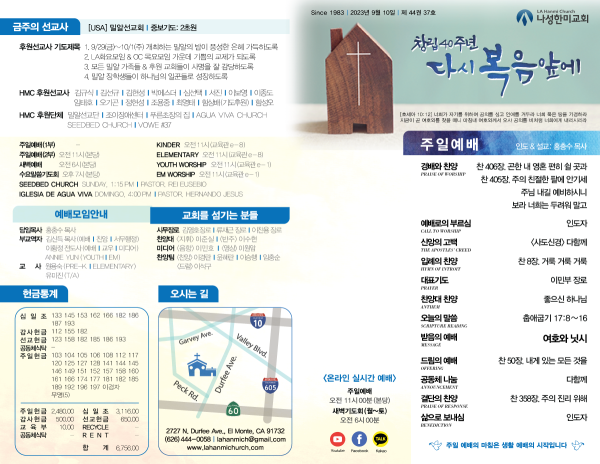2023년 9월 10일 페이지 정보 작성자 나성한미교회 댓글 0건 조회 2,914회 작성일 23-09-09 12:48 목록 본문 이전글2023년 9월 17일 23.09.16 다음글2023년 9월 3일 23.09.02 댓글 0 댓글목록 등록된 댓글이 없습니다. 목록