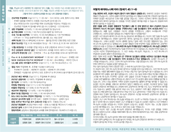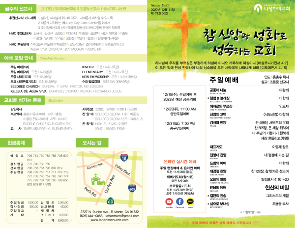 2022년 12월 11일 페이지 정보 작성자 나성한미교회 댓글 0건 조회 2,427회 작성일 22-12-16 11:03 목록 본문 이전글2022년 12월 18일 22.12.16 다음글2022년 12월 4일 22.12.03 댓글 0 댓글목록 등록된 댓글이 없습니다. 목록