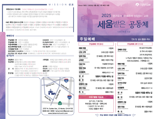 2025년 5월 4일 페이지 정보 작성자 나성한미교회 댓글 0건 조회 971회 작성일 25-05-03 14:00 목록 본문 2025년 5월 4일 이전글2025년 5월 11일 25.05.10 다음글2025년 4월 27일 25.04.26 댓글 0 댓글목록 등록된 댓글이 없습니다. 목록