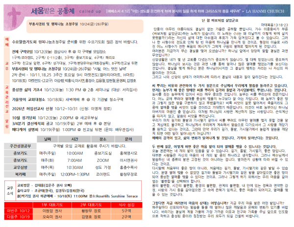 20251012 주보 페이지 정보 작성자 나성한미교회 댓글 0건 조회 32회 작성일 25-10-11 06:32 목록 본문 20251012 주보 다음글20251005 주보 25.10.04 댓글 0 댓글목록 등록된 댓글이 없습니다. 목록