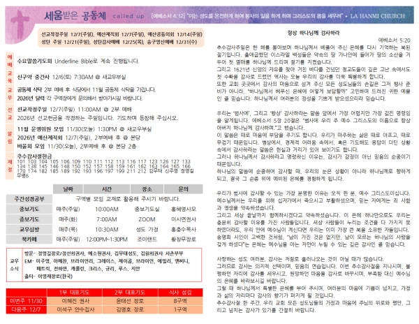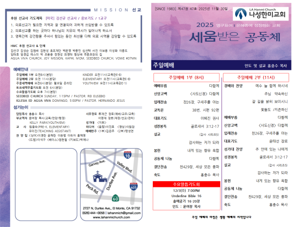 20251130 주보 페이지 정보 작성자 나성한미교회 댓글 0건 조회 115회 작성일 25-11-29 09:03 목록 본문 20251130 주보 이전글20251207 주보 25.12.06 다음글20251123 주보 25.11.21 댓글 0 댓글목록 등록된 댓글이 없습니다. 목록